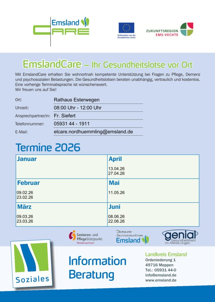 Mit dem Projekt EmslandCare erweitert der Landkreis Emsland gemeinsam mit den emsländischen Städten, Samtgemeinden und Gemeinden die Unterstützungsangebote im Gesundheits- und Pflegebereich.